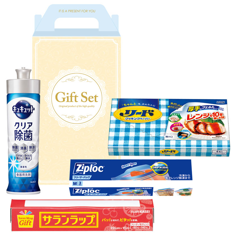 ●内容/ライオンリードクッキングペーパー小4枚入、ジップロックフリーザーバッグM3枚入、サランラップミニ22cm×15m、花王キュキュットクリア除菌220ml各1個